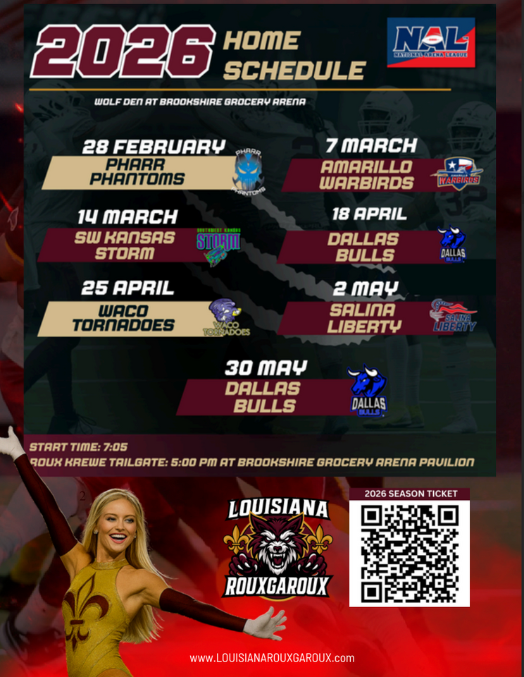 News Slider{{widget.isRotating ? 'pause_circle' : 'play_circle'}}NAL Welcomes Louisiana Rouxgaroux Under New Ownership Read More Shreveport Rouxgaroux Partner with GOAT Sports Marketing Read More Shreveport Rougaroux Announces Strategic Partnership with D1 Shreveport Read More Shreveport Rouxgaroux Join the National Arena League Read More NAL Welcomes Louisiana Rouxgaroux Under New OwnershipShreveport Rouxgaroux Partner with GOAT Sports MarketingShreveport Rougaroux Announces Strategic Partnership with D1 ShreveportShreveport Rouxgaroux Join the National Arena League
